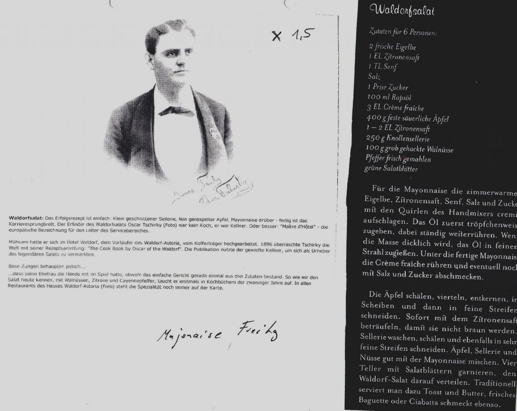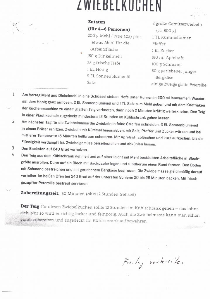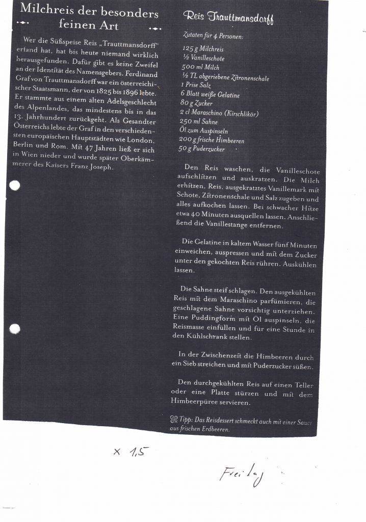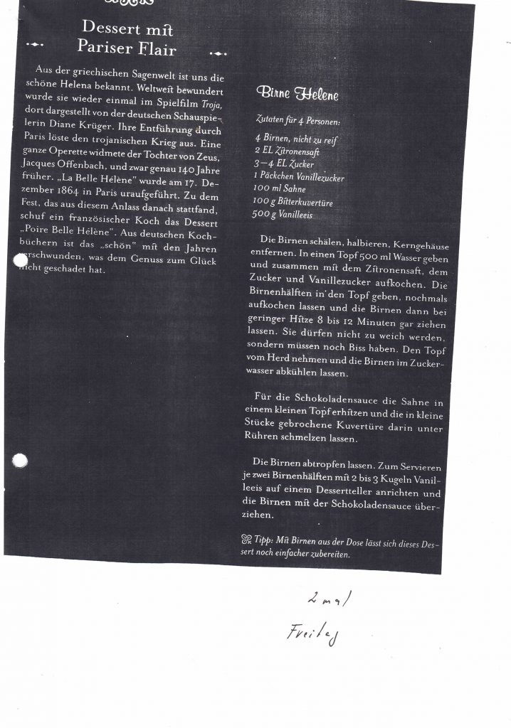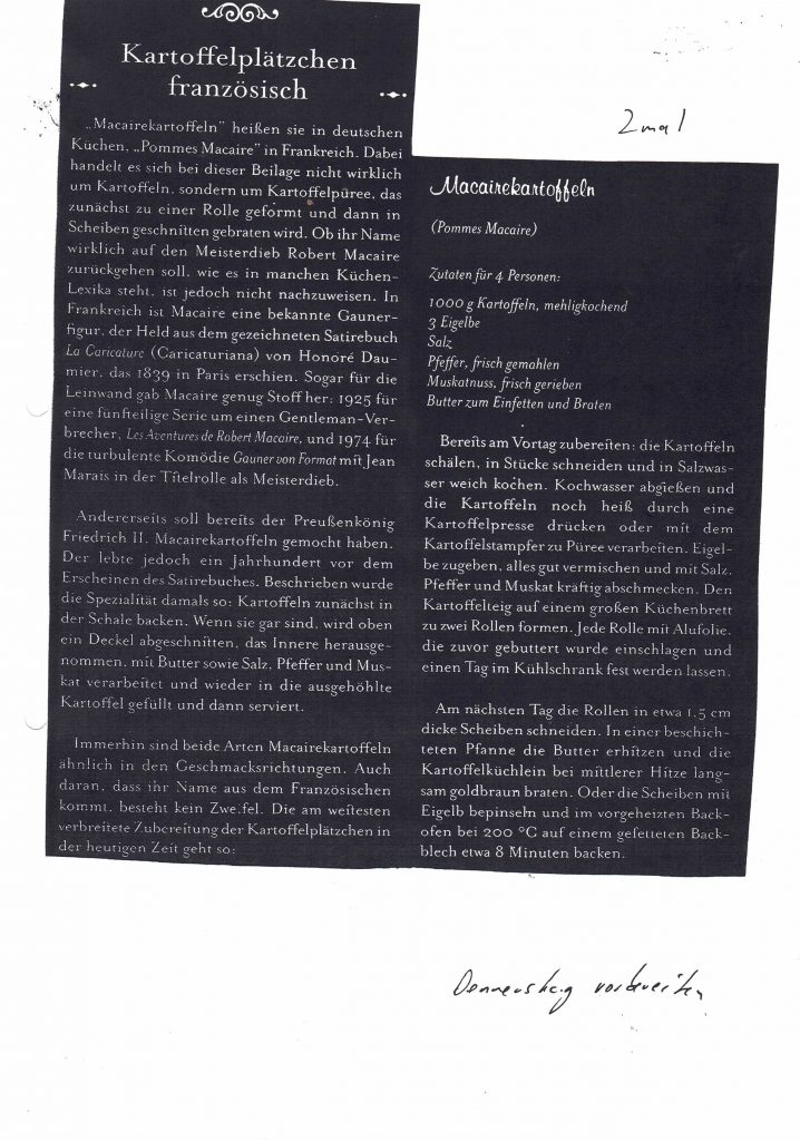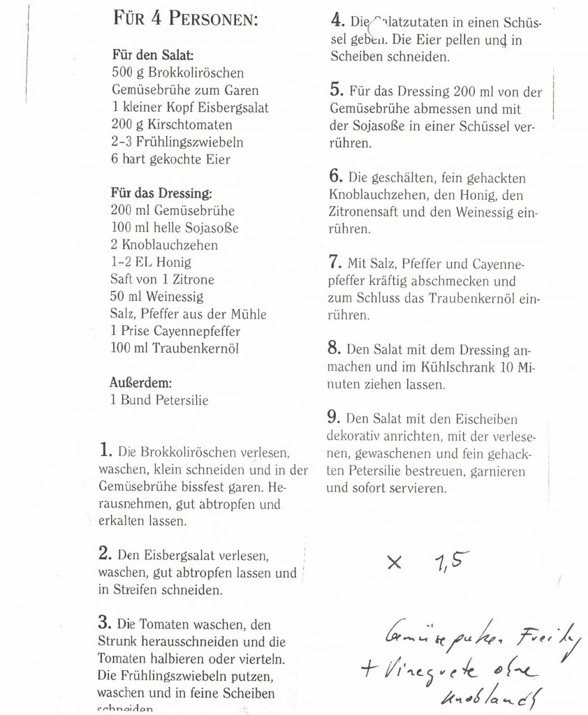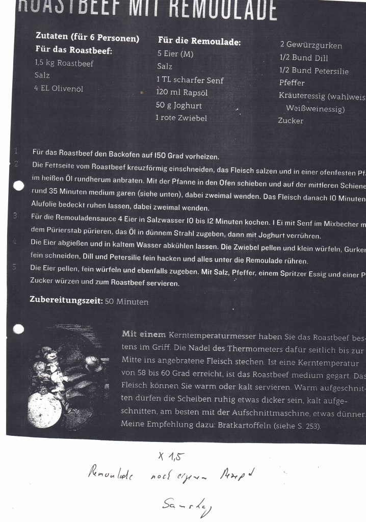 Man sieht in den folgenden Rezeptkopien auch die Mengenvervielfältigung für mein 25 Personen-Büfett. X 1,5 heißt also anderthalbfache Menge. Verzeiht aber bitte meine mangelnde Sorgfalt beim Ausschneiden, Aufkleben und Ausrichten der Kopien. Die ausgehändigten Rezeptkopien taugten nach dem Tohuwabohu in der Küche, verziert mit Speiseresten oder aufgeweicht vom Spülwasser ohnehin nur noch für den Mülleimer. Aber ihr wisst natürlich, dass ihr jedes Bild vergrößern, kontrastreicher oder anders bearbeiten könnt, wenn ihr die Lesbarkeit erhöhen wollt.